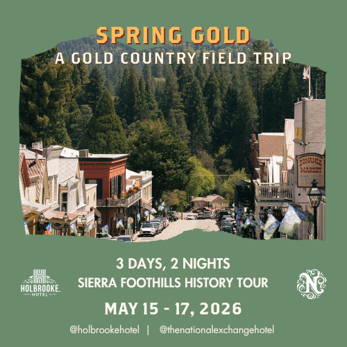 Two nights. Two legendary hotels. One very good long weekend in the Sierra Foothills. “Spring Gold” pairs a night at the Holbrooke in Grass Valley with a night at The National Exchange in Nevada City, with chef’s tasting dinners, hosted cocktails, guided history tours, a Sierra Foothills hike, and a visit to the historic Nevada Theatre all included. The full package from only $1,395 + tax, single occupancy.
